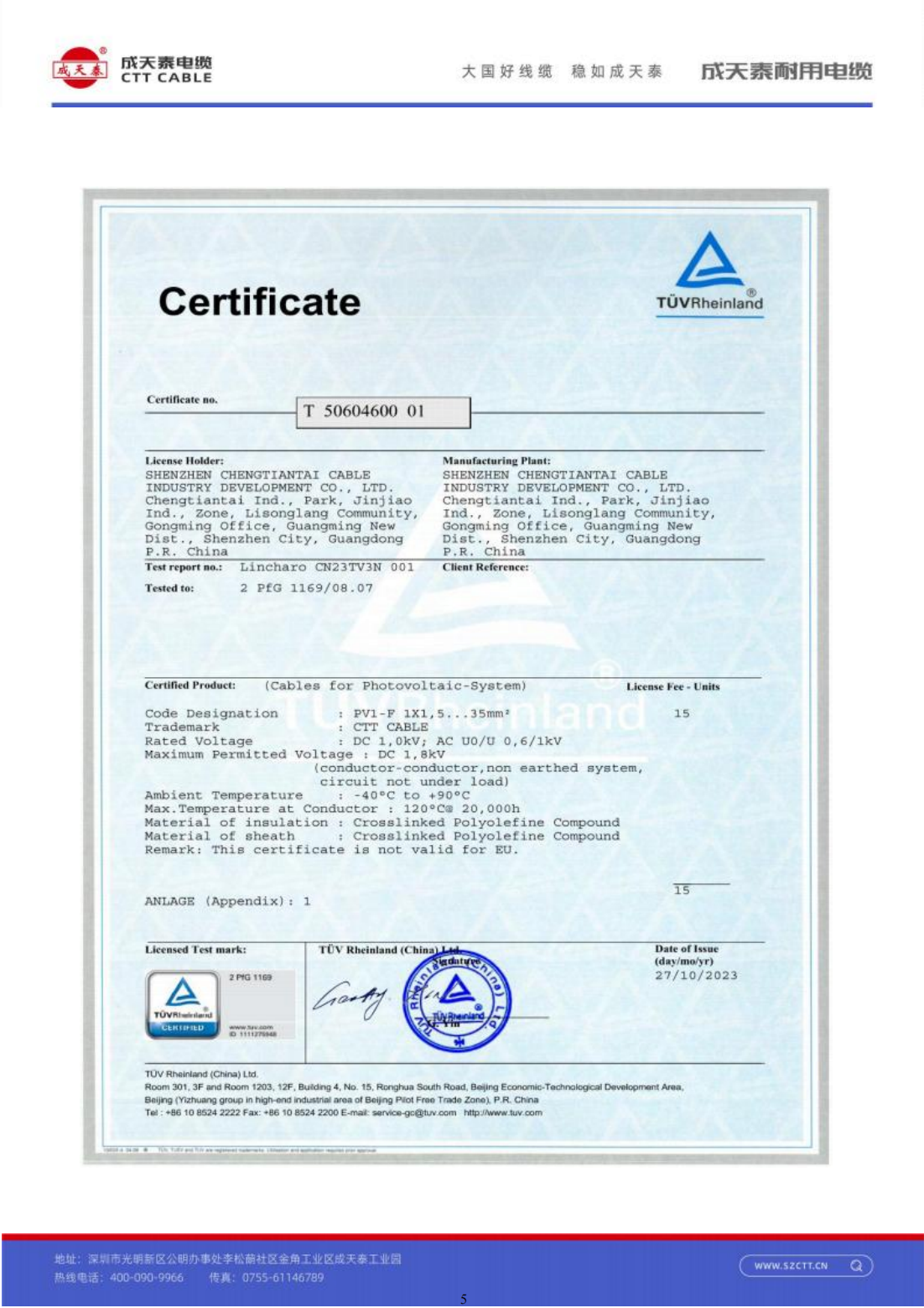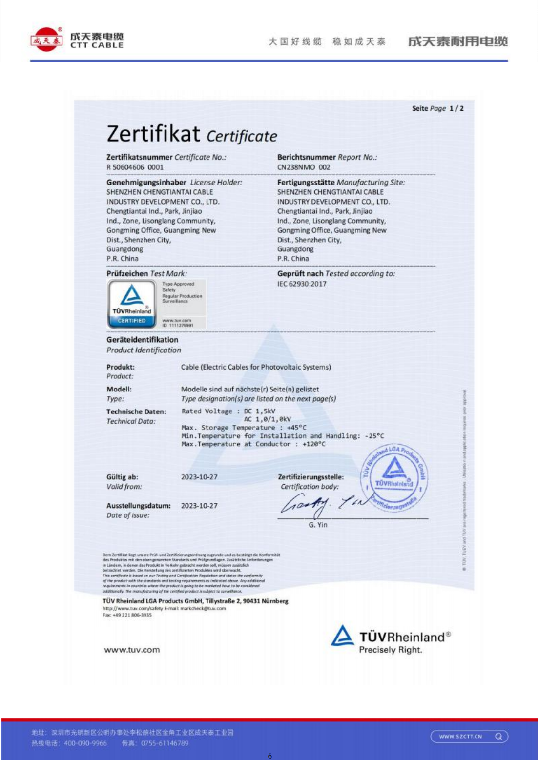 A1: The solar power cable is from the brand CTT CABLE, and the model number is PV1-F 1x1.5...35/H1Z2Z2-K/62930 IEC 131.